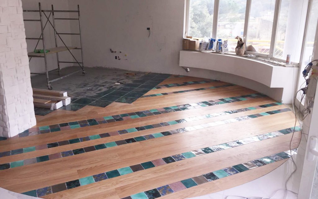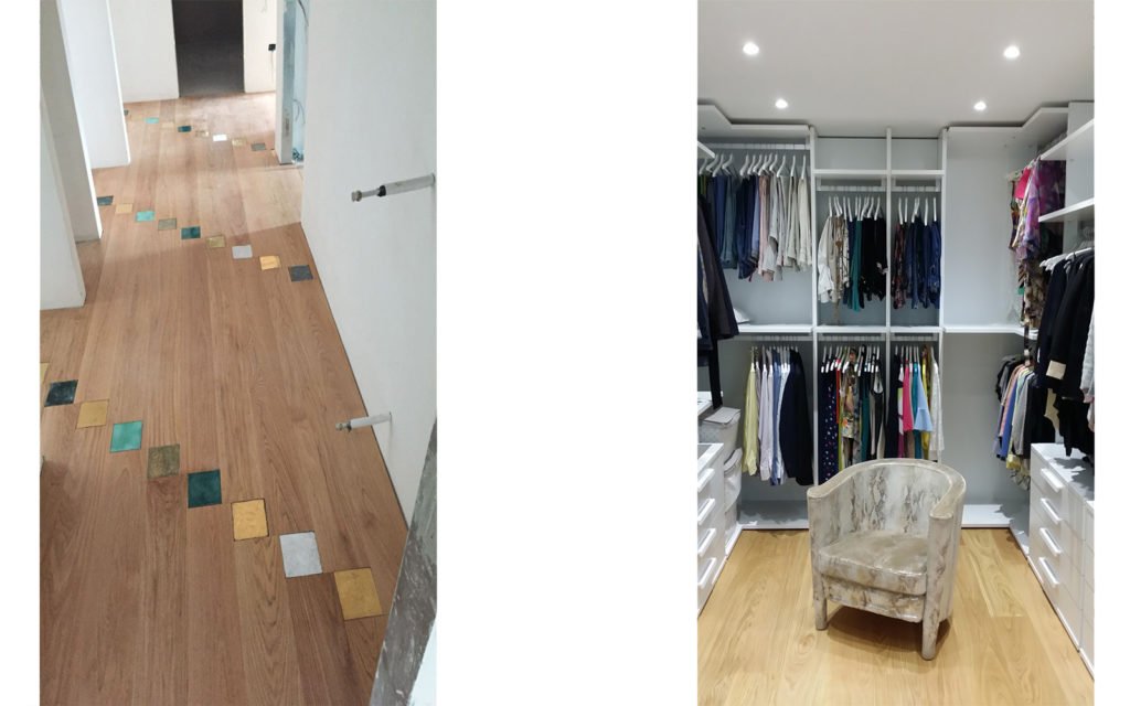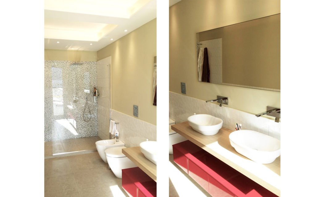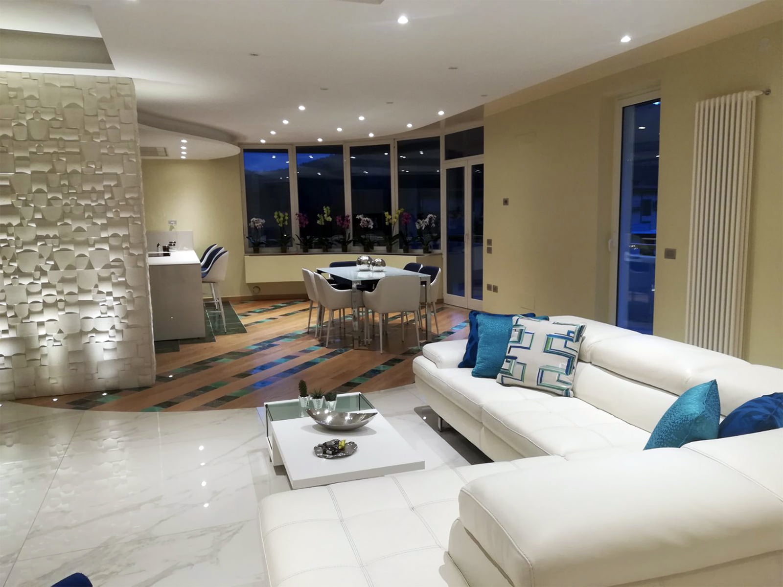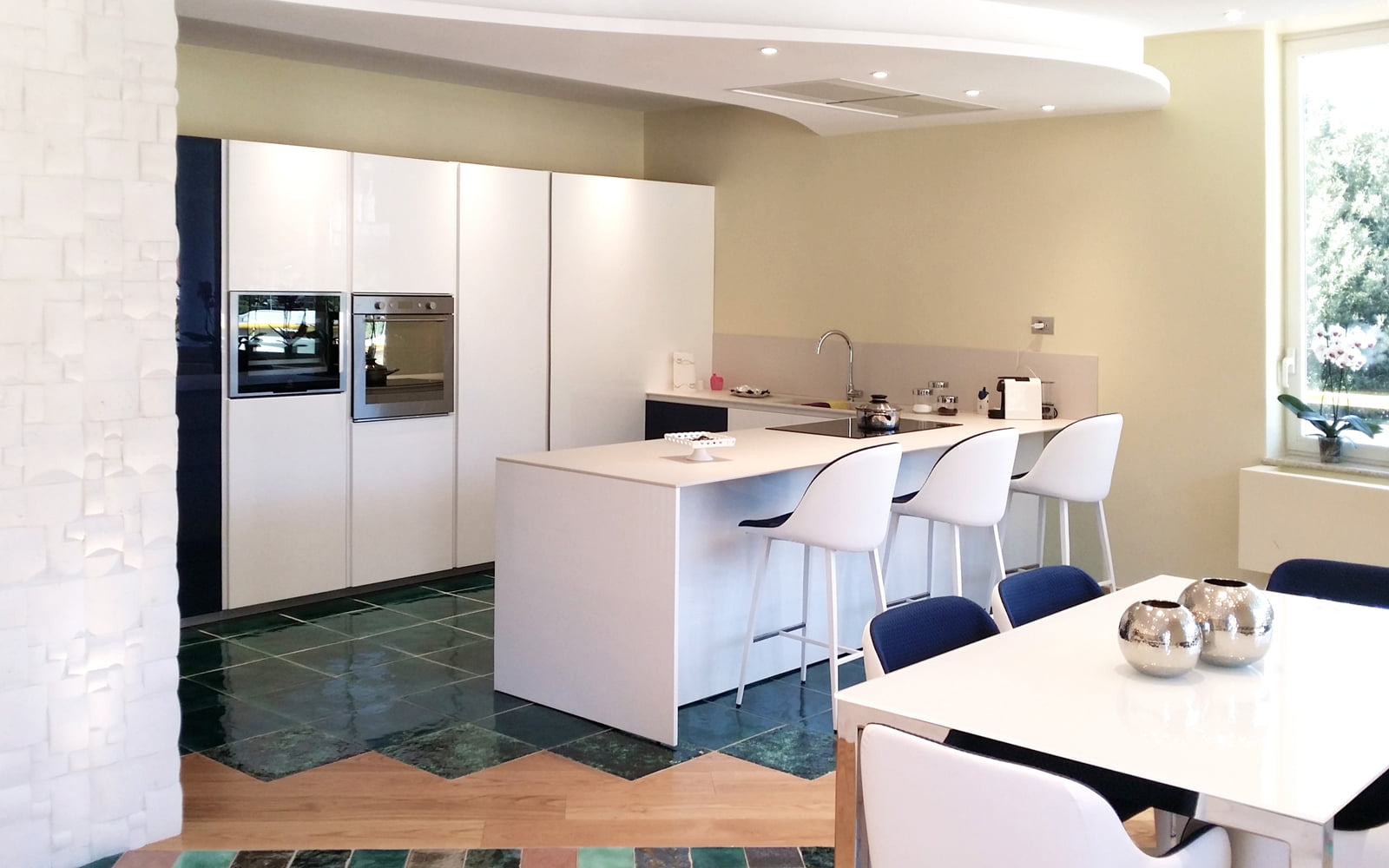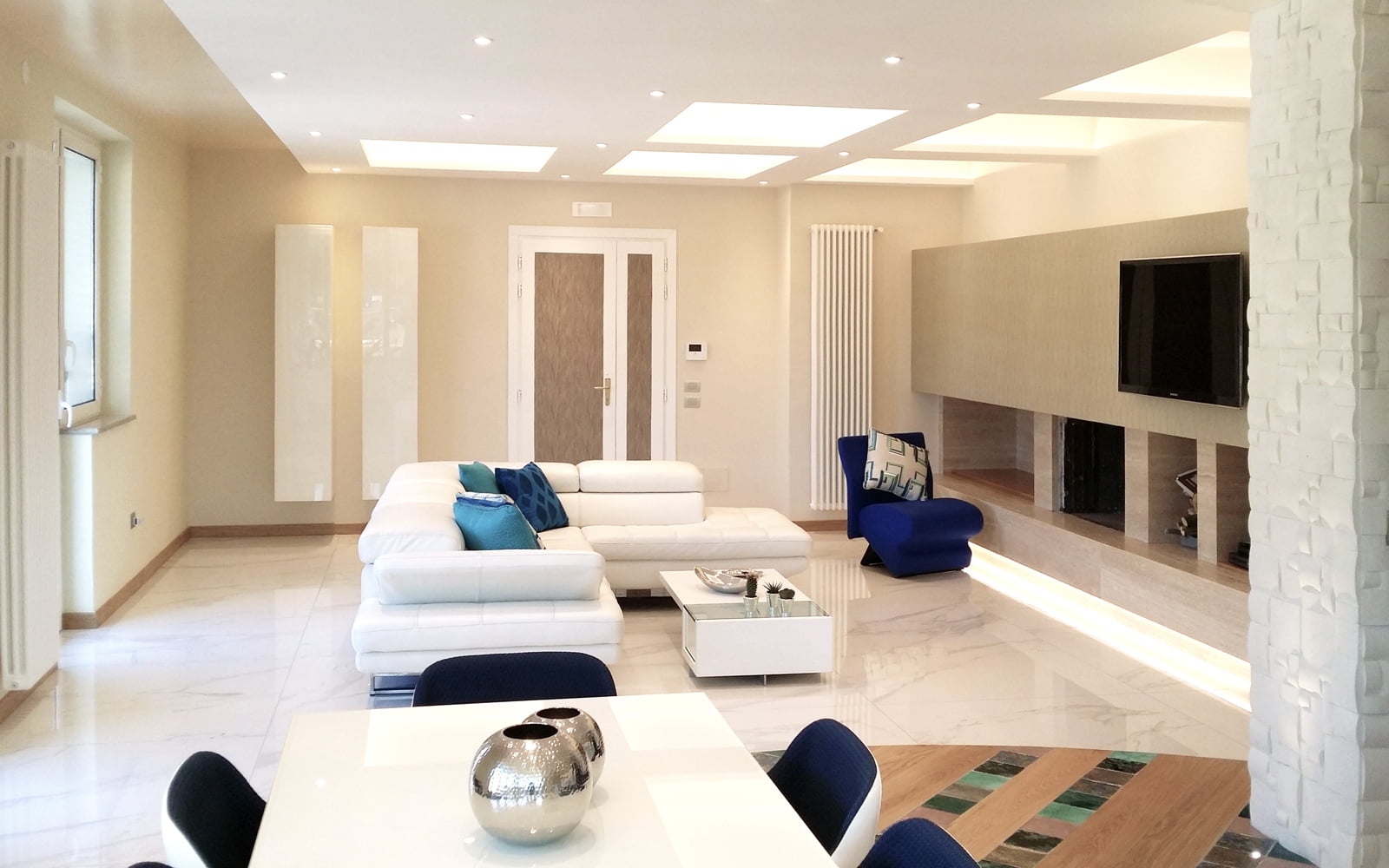 La pavimentazione sobria ed elegante dell’ingresso, grazie alle lastre di marmo di Carrara, crea un unico piano lucido che riflette la luce che proviene dalle vetrate dei balconi e si confronta con il colore deciso e dal carattere forte della ceramica Vietrese posata nella zona cucina attraverso un’area di passaggio rappresentata dalla zona pranzo tramite un gioco di forme realizzato con lastre in parquet di Rovere ed inserti di ceramica realizzata a mano.