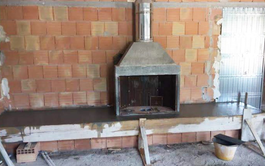 La parete attrezzata del soggiorno ingloba il camino con elementi volumetrici razionali e viene realizzata in opera con una base in c.a. e pareti in blocchi forati.
