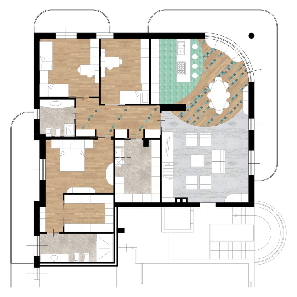 La scelta delle texture, dei colori, dei materiali e delle forme dell’arredo completano le geometrie degli spazi rendendoli articolati e funzionali.