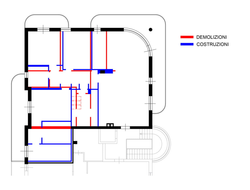 La prima fase di cantiere prevede la demolizione totale dei tramezzi, per dare maggiore libertà nella progettazione della fluidità ed ergonomia dello spazio, la demolizione dei massetti, delle pavimentazioni e dei relativi impianti.
