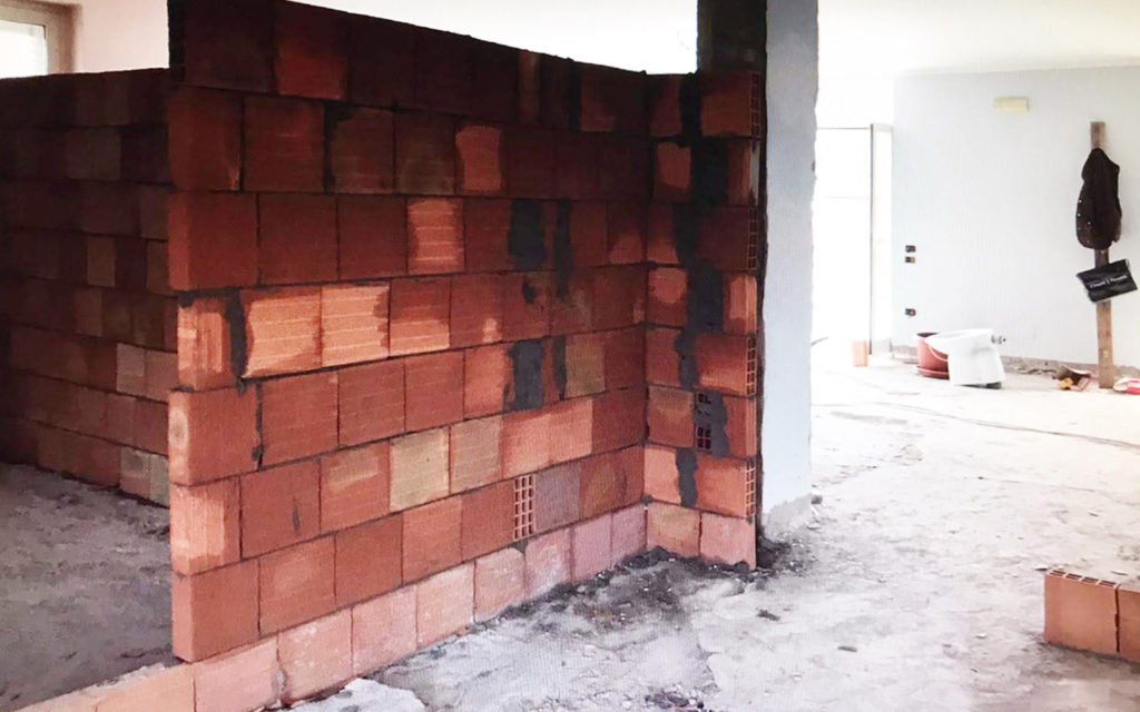 Una volta elaborata la pianta delle demolizioni e ricostruzioni, si passa alla seconda fase di cantiere, che consiste nello “spiccato dei tramezzi”, realizzati in blocchi forati in laterizio dello spessore di 8 cm e malta cementizia ed ancorati con cordolo in c.a. nel rispetto della normativa tecnica in zona sismica.