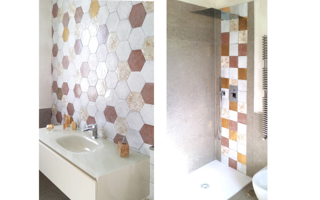 Nei bagni prosegue il dialogo tra elementi diversi, lastre in gres effetto pietra che fanno risaltare gli elementi decorativi di pregio in ceramica lavorata a mano.