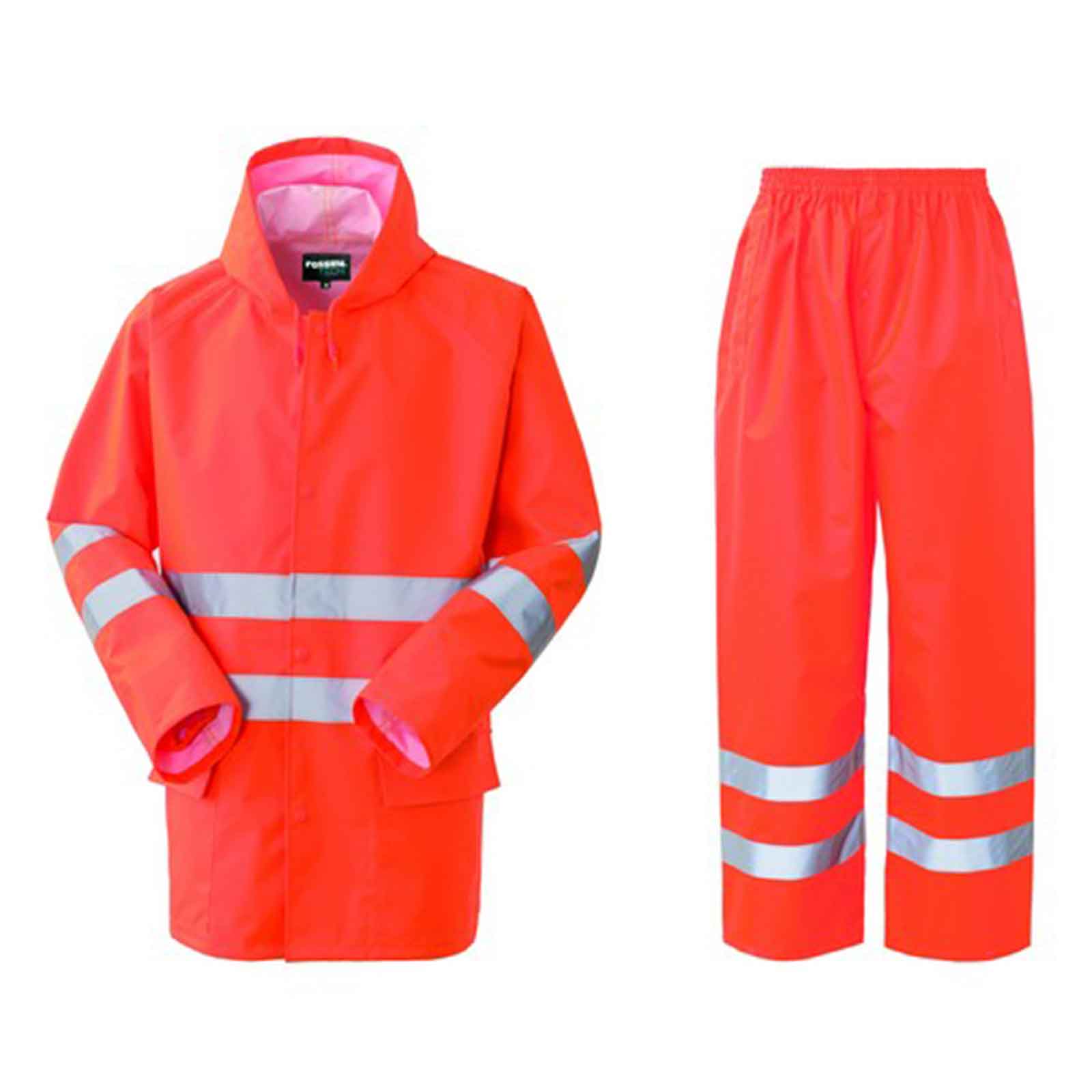 PANTALONE: Elastico su tutto il girovita, due aperture laterali, apertura alla patta chiusa con bottone automatico, fondo gamba richiudibile con bottone automatico, doppie bande rifrangenti.
