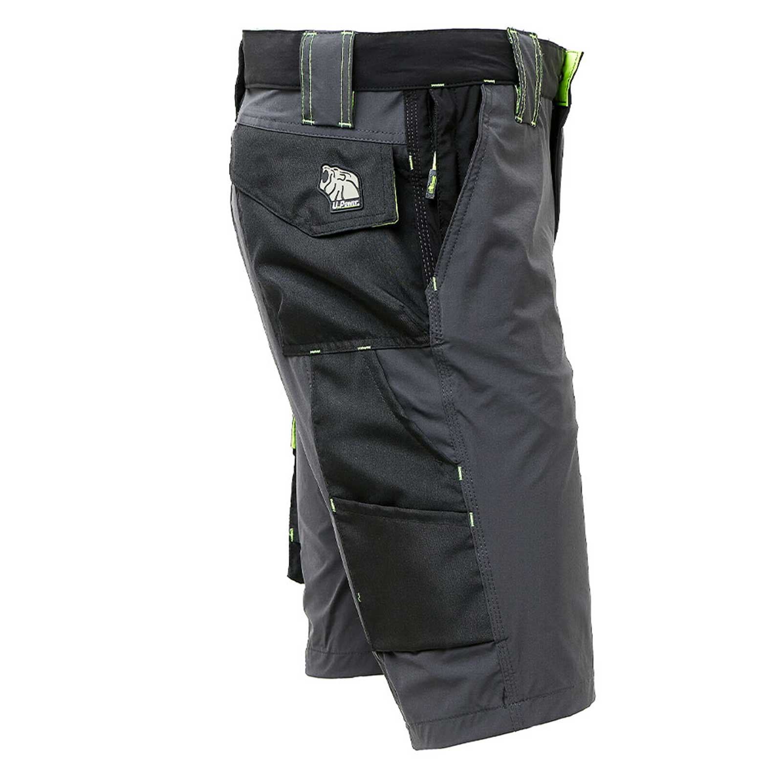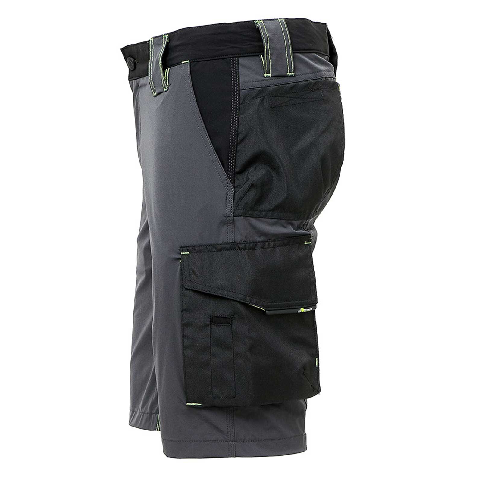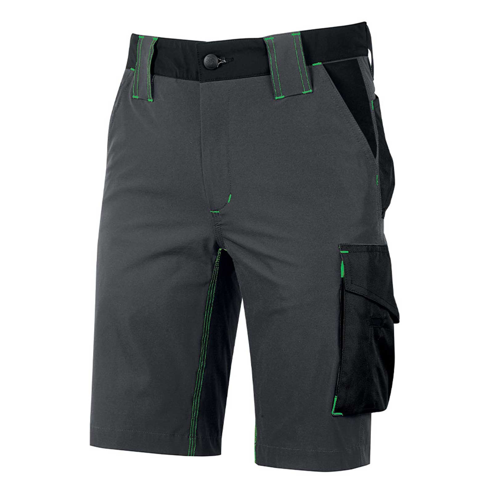 Bermuda da lavoro colore grigio e verde Asphalt Grey/Green in tessuto U-4 (U-Power 4 way stretch) molto comodo, resistente, morbido sulla pelle, idrorepellente, traspirante e asciuga rapidamente.