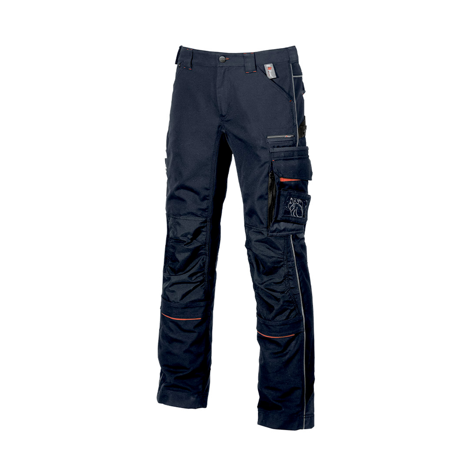 Pantalone dotato di 2 ampie tasche anteriori, tasca zip invisibile, tasca laterale portautensili, tasca laterale multifunzionale, 2 Free Pocket posteriori con chiusura di sicurezza a velcro, 2 tasche porta ginocchiera in Cordura® con interno elasticizzato; porta martello regolabile.