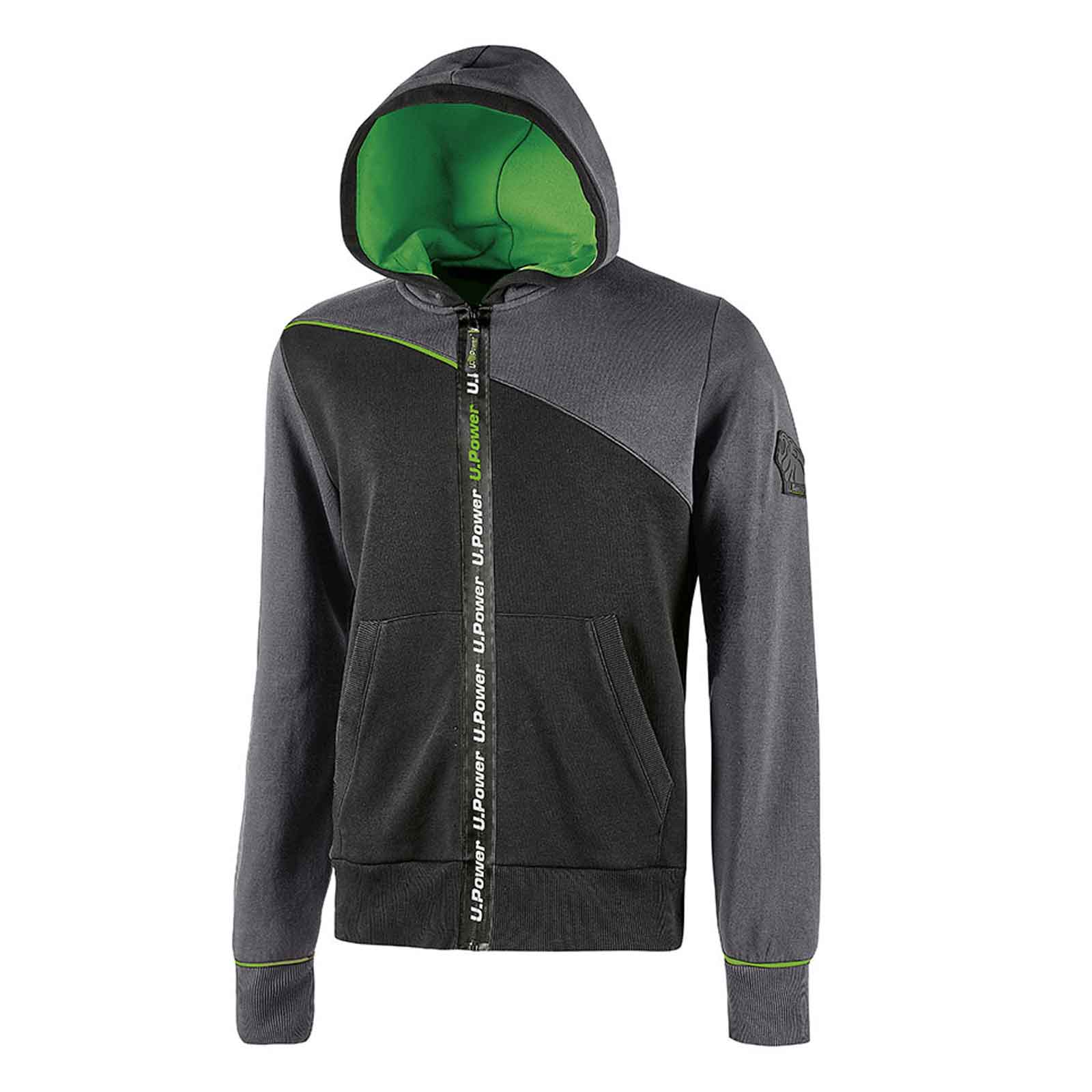 Felpa da lavoro full zip, con cappuccio regolabile. Chiusura con zip centrale impermeabile e serigrafia “U-Power”. Tasche applicate con ingresso obliquo. Polsi e fondo a costine elasticizzate. Inserti in piping fluo elasticizzato.