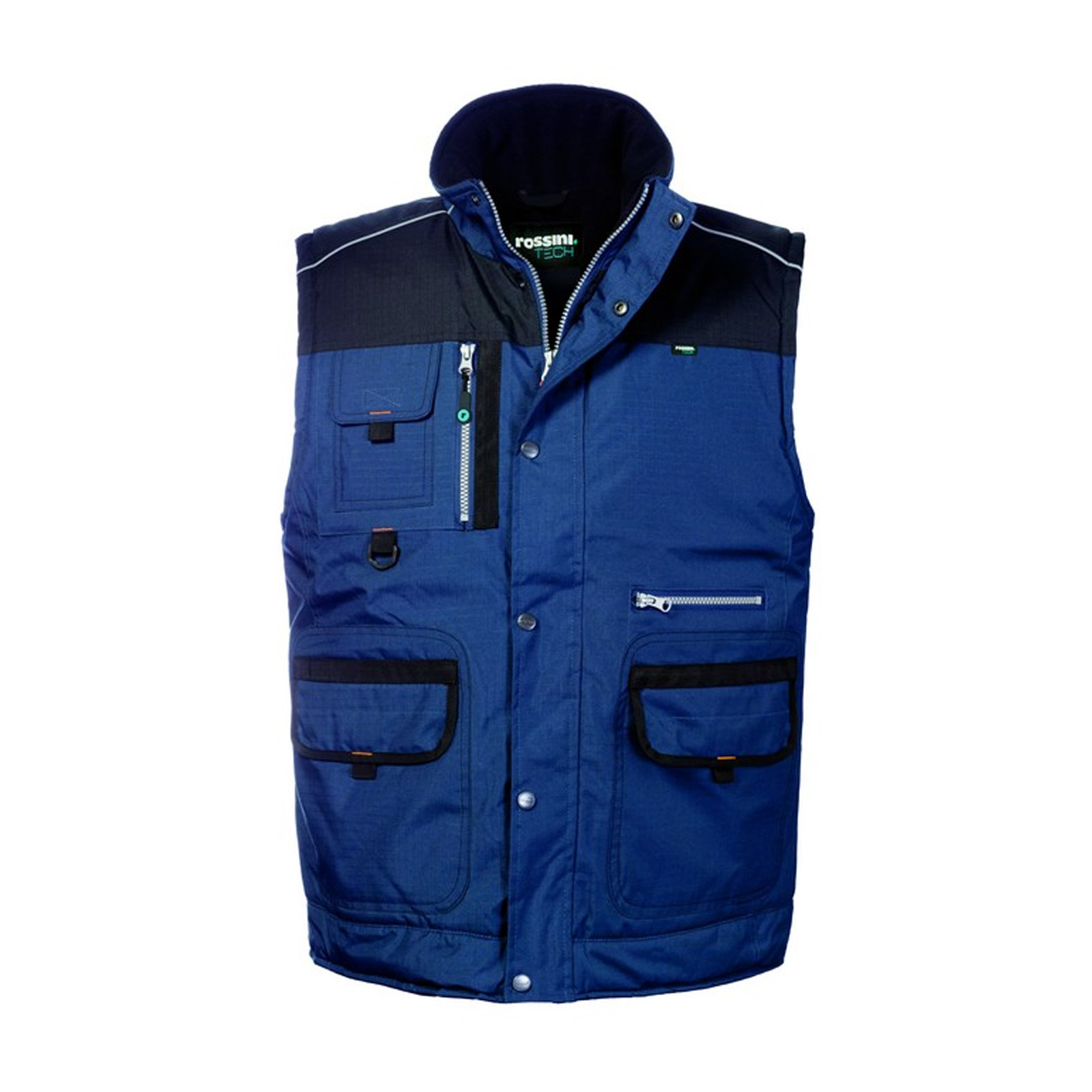 Rossini Bradford è il gilet imbottito ideale a lavoro. Possiede la chiusura anteriore con cerniera coperta da patella chiusa con bottoni automatici, portacellulare chiuso con aletta e velcro applicato al petto destro, una tasca a filetto accanto al portacellulare chiusa con cerniera verticale, due tasche inferiori applicate chiuse con aletta e velcro, un taschino a sinistra a filetto chiuso con cerniera, coulisse di chiusura al fondo, una comoda tasca interna a sinistra chiusa con velcro e foro di aerazione su schiena per maggiore confort.