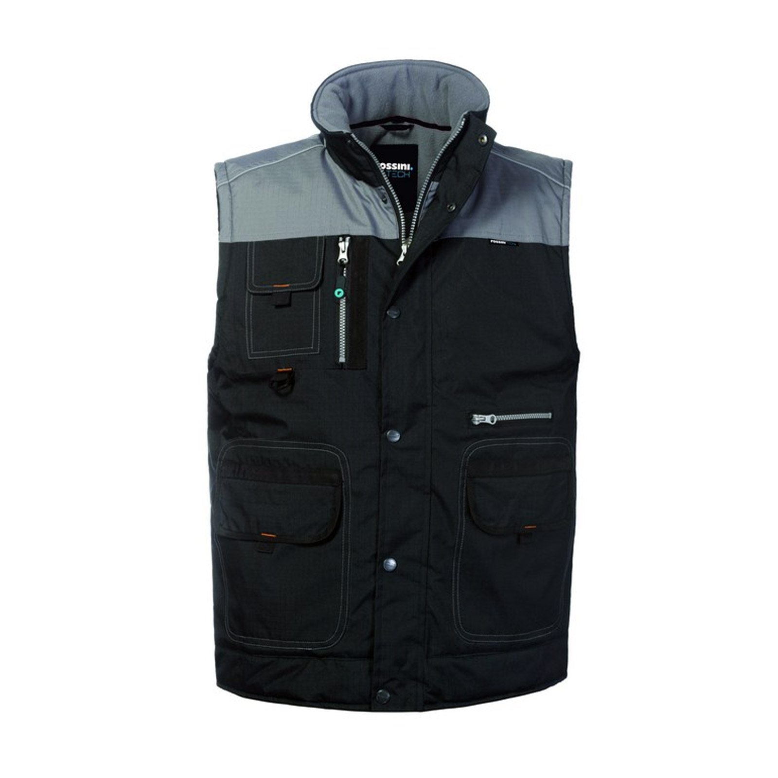 Rossini Bradford è il gilet imbottito ideale a lavoro. Possiede la chiusura anteriore con cerniera coperta da patella chiusa con bottoni automatici, portacellulare chiuso con aletta e velcro applicato al petto destro, una tasca a filetto accanto al portacellulare chiusa con cerniera verticale, due tasche inferiori applicate chiuse con aletta e velcro, un taschino a sinistra a filetto chiuso con cerniera, coulisse di chiusura al fondo, una comoda tasca interna a sinistra chiusa con velcro e foro di aerazione su schiena per maggiore confort.