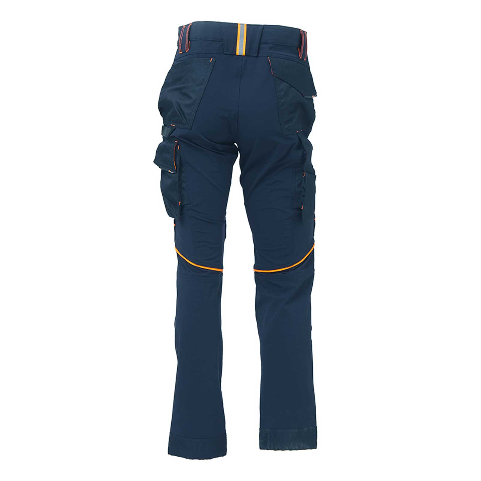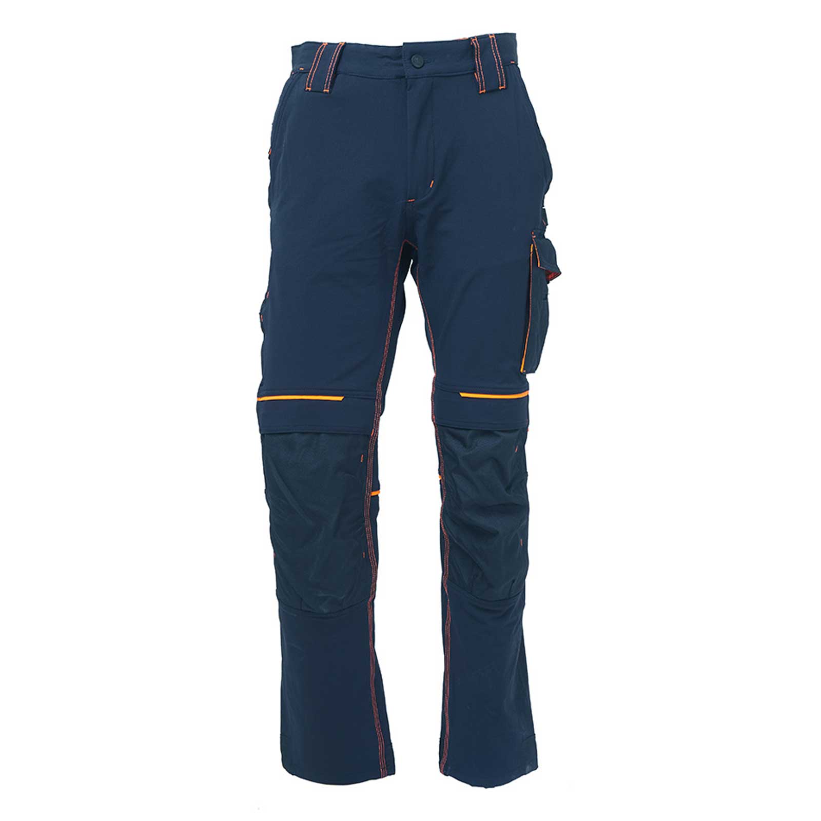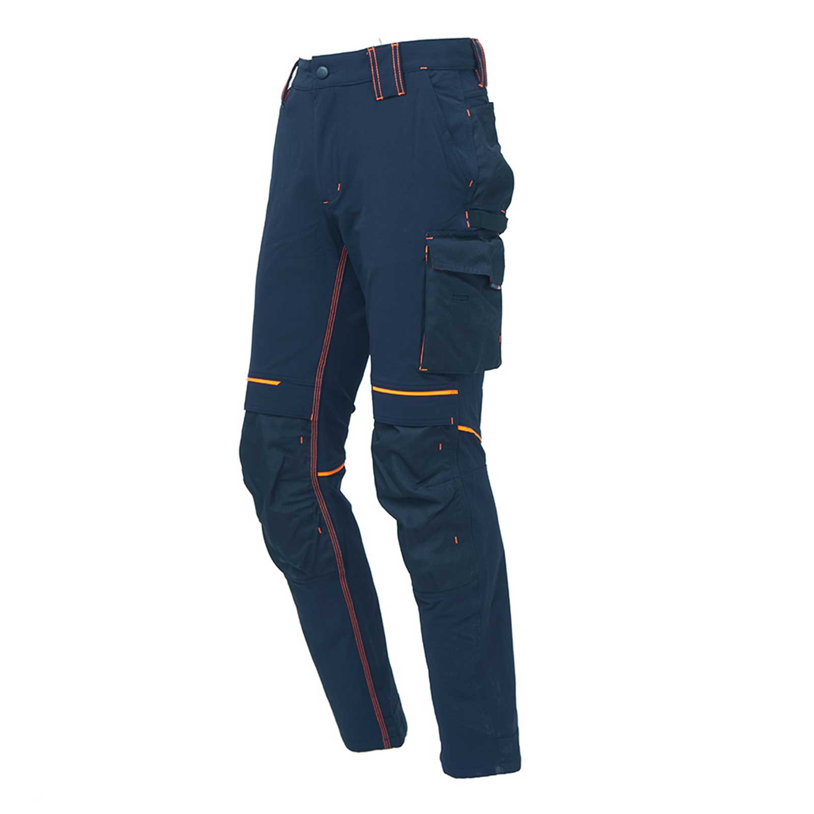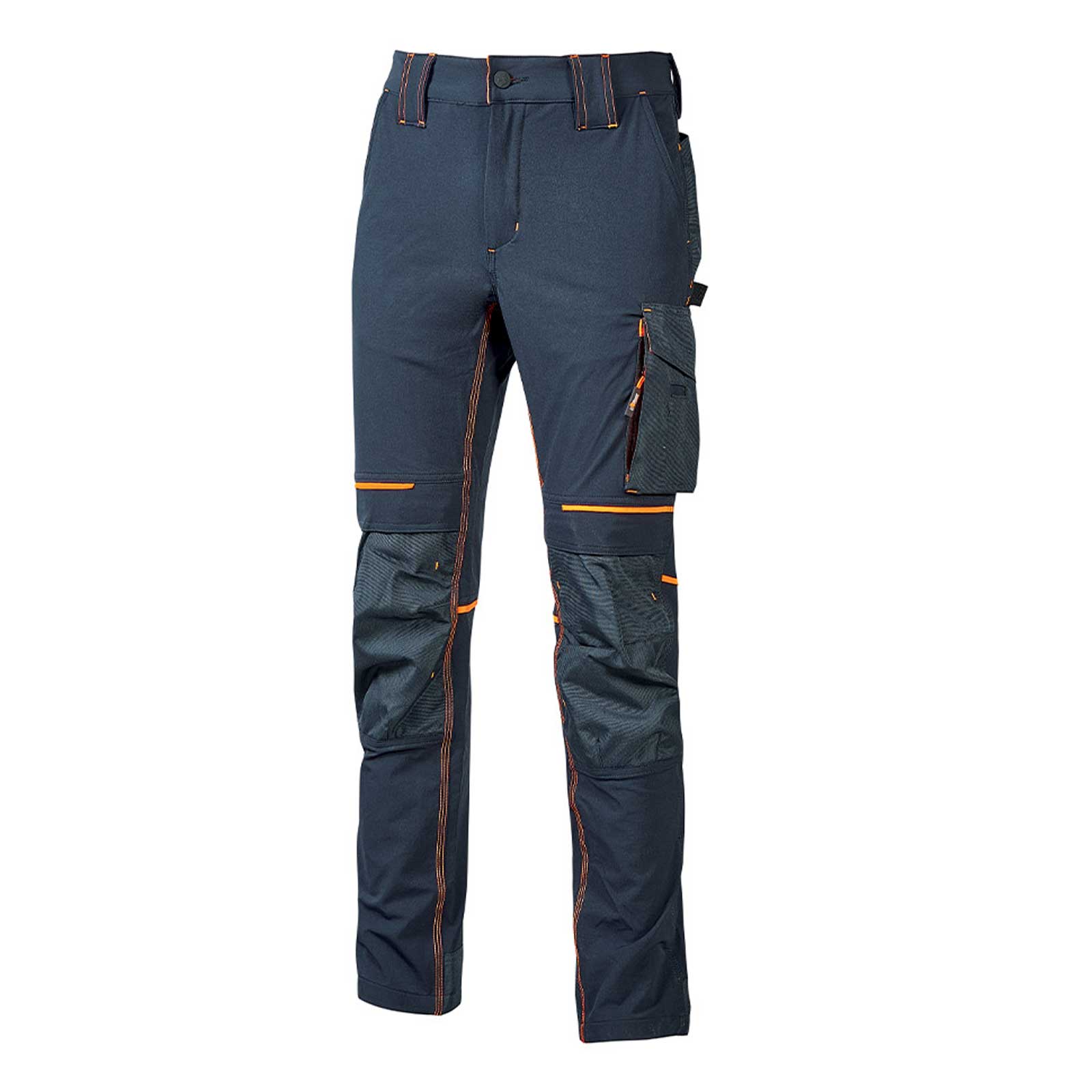 Pantalone da lavoro in tessuto U-4 (U-Power 4 way stretch) molto comodo, resistente, morbido sulla pelle, idrorepellente, traspirante e asciuga rapidamente. Dotato di due ampie tasche anteriori, elastico in vita con un sistema innovativo di regolazione a scomparsa. Carrè posteriore accentuato per una maggior protezione della parte lombare e nastro rosso/reflex su passante tubolare posteriore. Tasca laterale porta utensili, multifunzionale con porta badge a scomparsa, due tasche posteriori di cui una con pattina e una con chiusura di sicurezza a velcro, due tasche porta ginocchiera con ingresso facilitato e battitacco tutto in resistente polyoxford 600D. Due tasche, chiuse con zip in corrispondenza del tascone laterale e della tasca frontale destra. Triple cuciture. Bottone antigraffio, zip YKK, Slim Fit.