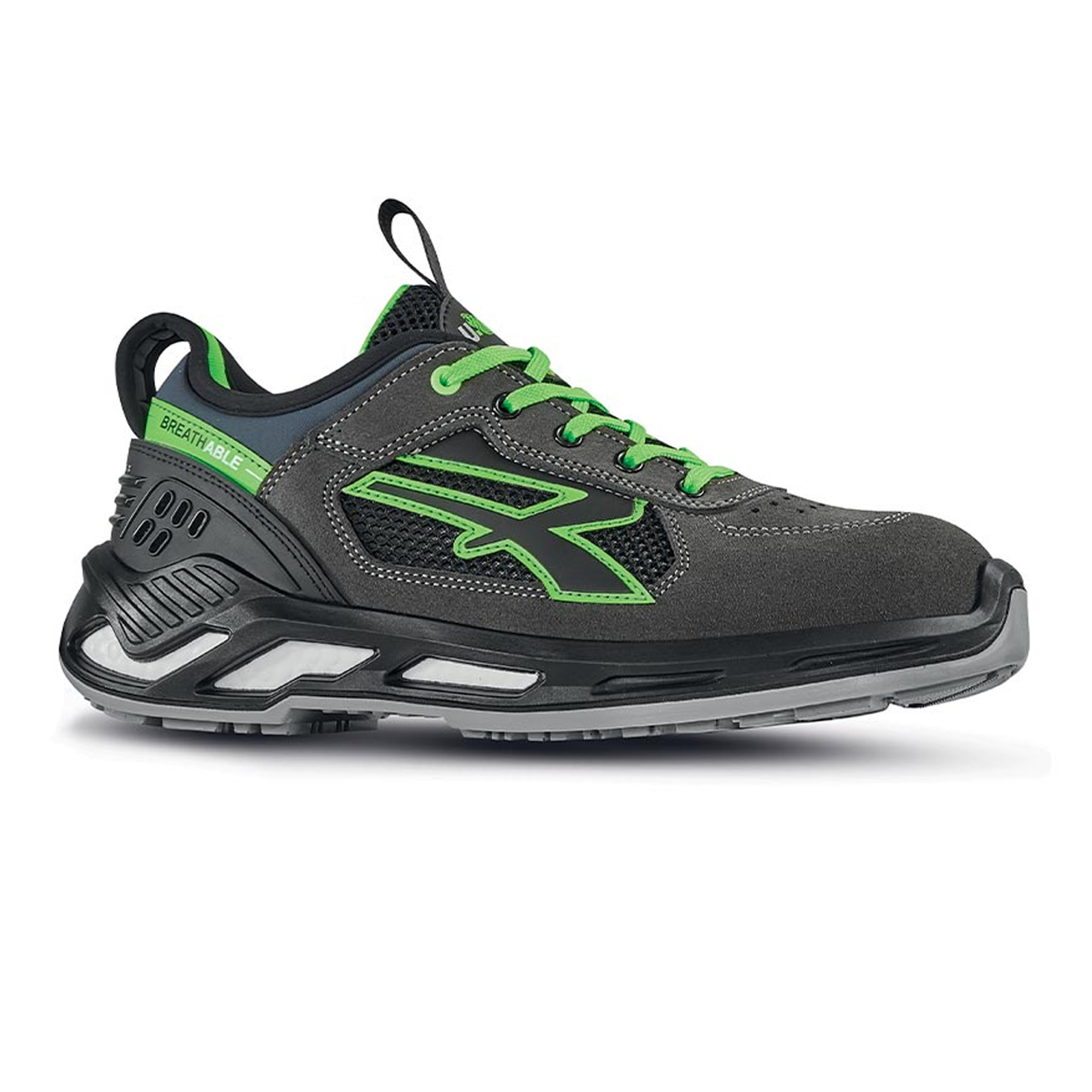 Scarpe antinfortunistiche basse, leggere e comode U-Power della linea Red 360, con tomaia in nylon ultra traspiranti e morbida pelle scamosciata, collarino con tessuto in fibra Lycra®, tallonetta anti-shock, puntale in alluminio, antiperforazione, antiscivolo e suola PU/PU infinergy, S1P SRC ESD