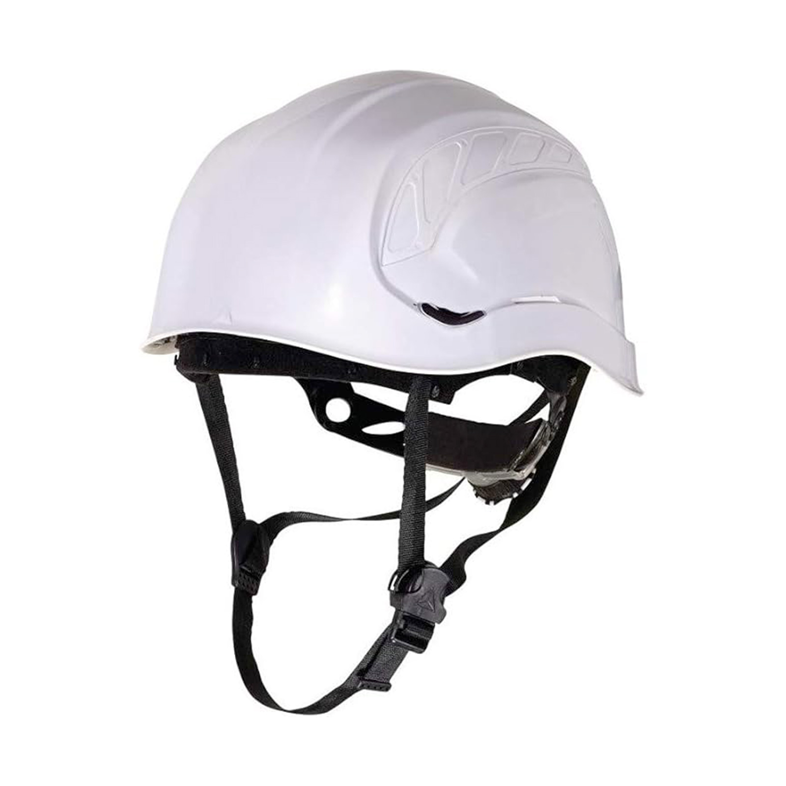 Elmetto da cantiere in ABS. Stile caschi alpinismo : senza frontino, per una migliore visione verticale. Ingombro minimo. Leggero. Cuffia poliammide : 3 fasce tessili con 8 punti di fissaggio. Frontalino antisudore termoformato. Sistema di chiusura ROTOR, regolabile : giro-testa da 53 a 63 cm. Venduto con sottogola a 3 punti di ancoraggio. Specifico per i lavori in altezza. Elmetto dielettrico (isolamento fino a 1000 VAC o 1500 VDC).