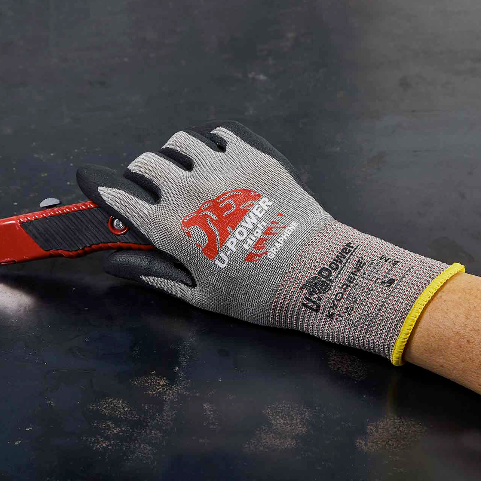 Guanti da lavoro termoregolatori con fodera in grafene Kyorene con finezza 13 e proprietà antimicrobiche, odor control, distribuzione e mantenimento del calore in maniera uniforme e costante.