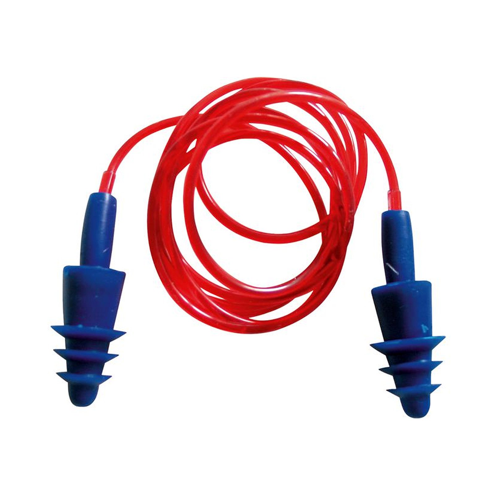 Confezione da 10 paia di tappi auricolari riutilizzabili in silicone con cordino di nylon. Ø 7-11 mm.