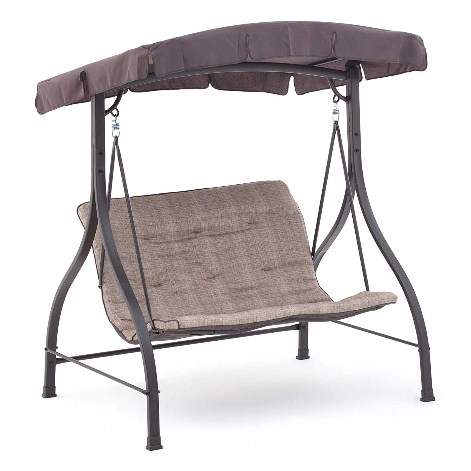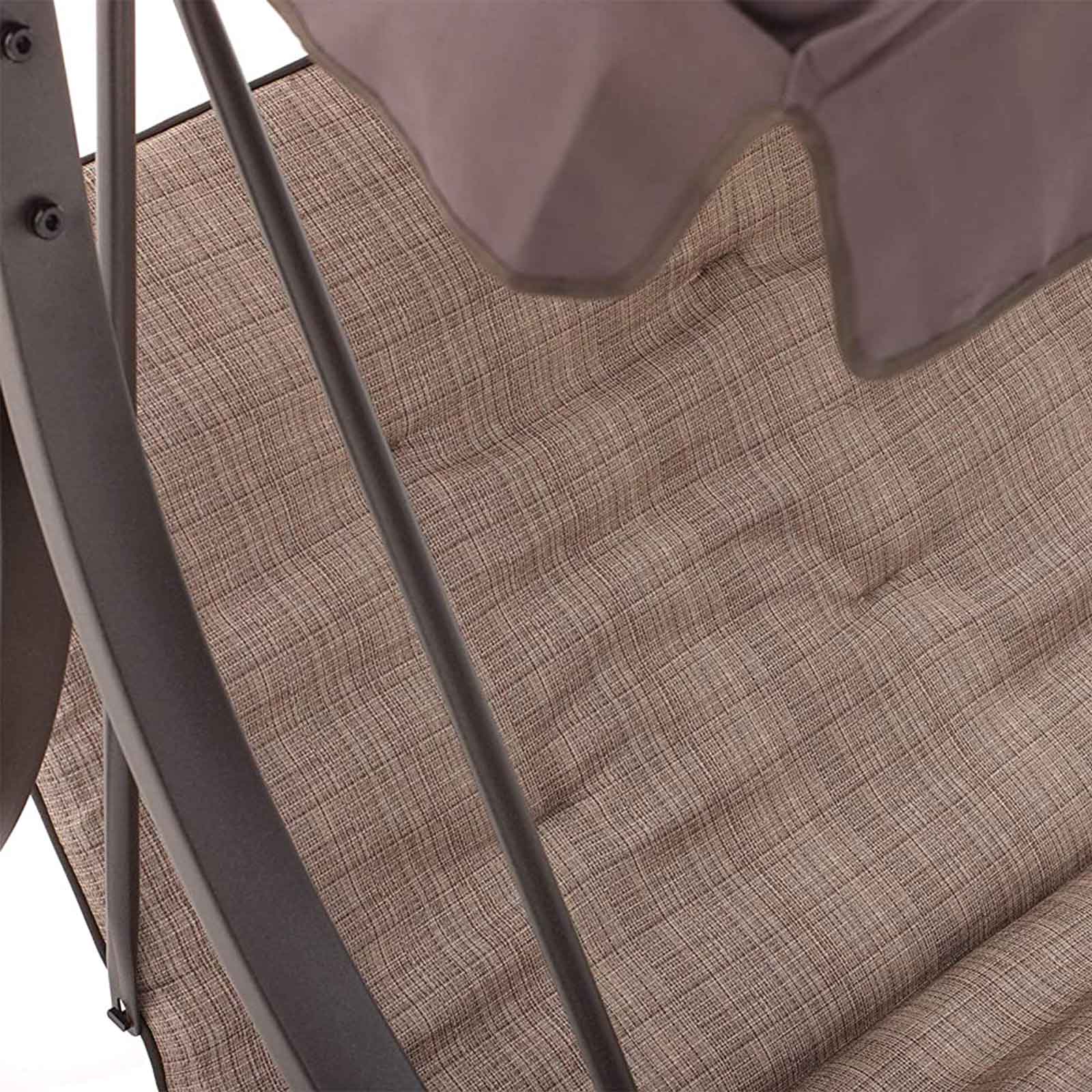 Dondolo da giardino a due posti con solida struttura in tubolare di ferro verniciato a polvere epossidica di colore marrone.