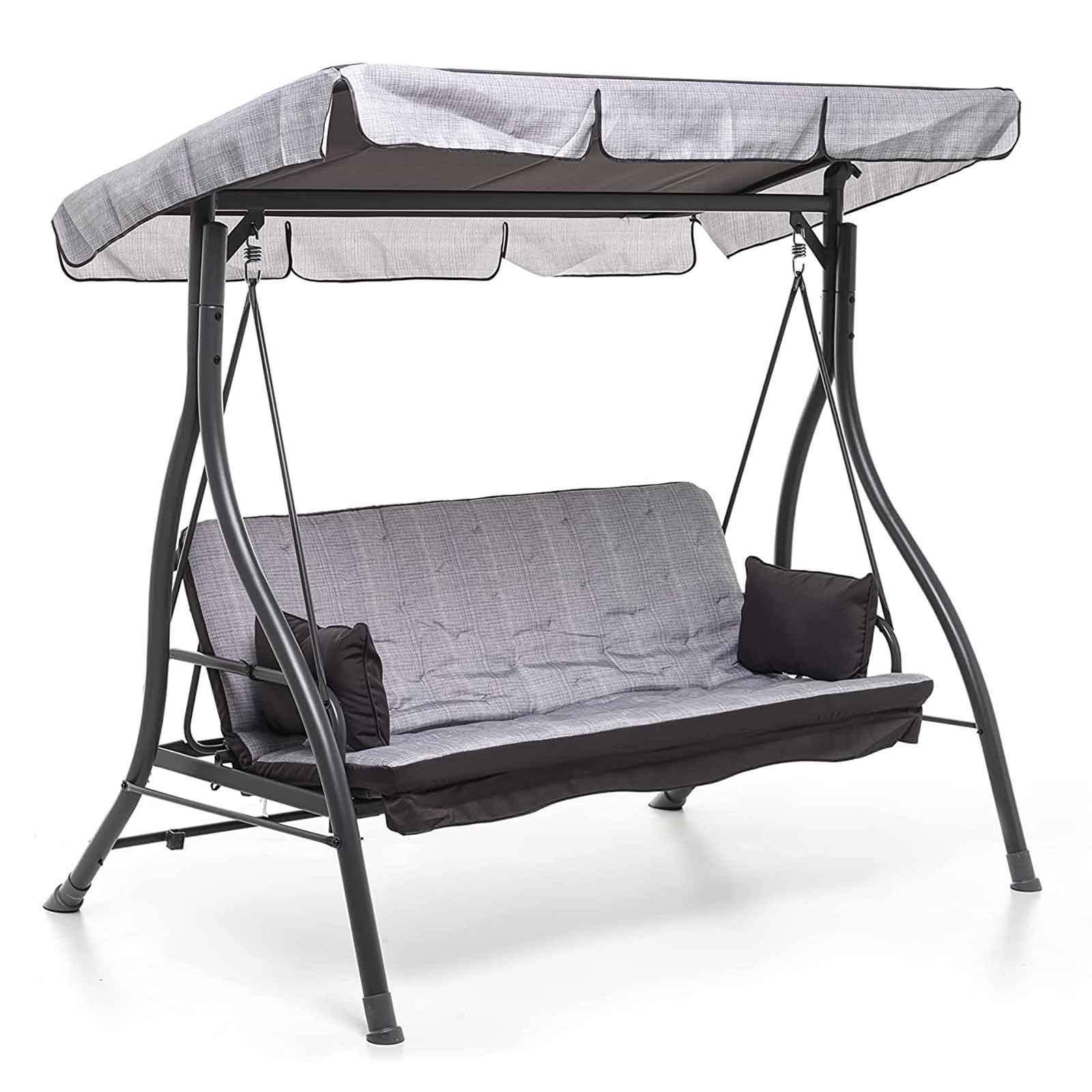 Comodo dondolo da giardino a tre posti con schienale reclinabile per una pratica funzione letto. La struttura è molto solida grazie al tubolare di ferro di colore antracite.