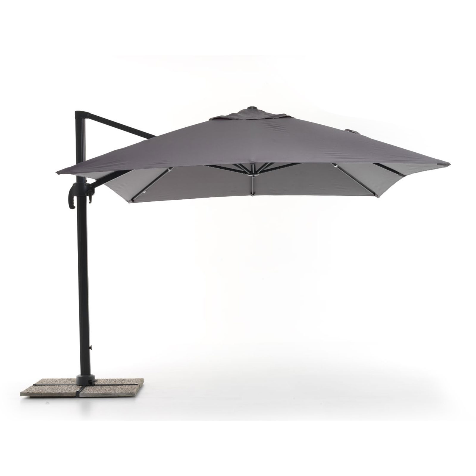 Elegante ombrellone inclinabile e impermeabile colore antracite con palo decentrato e braccio laterale a sbalzo misura 3×4 metri altezza 2,7 metri.