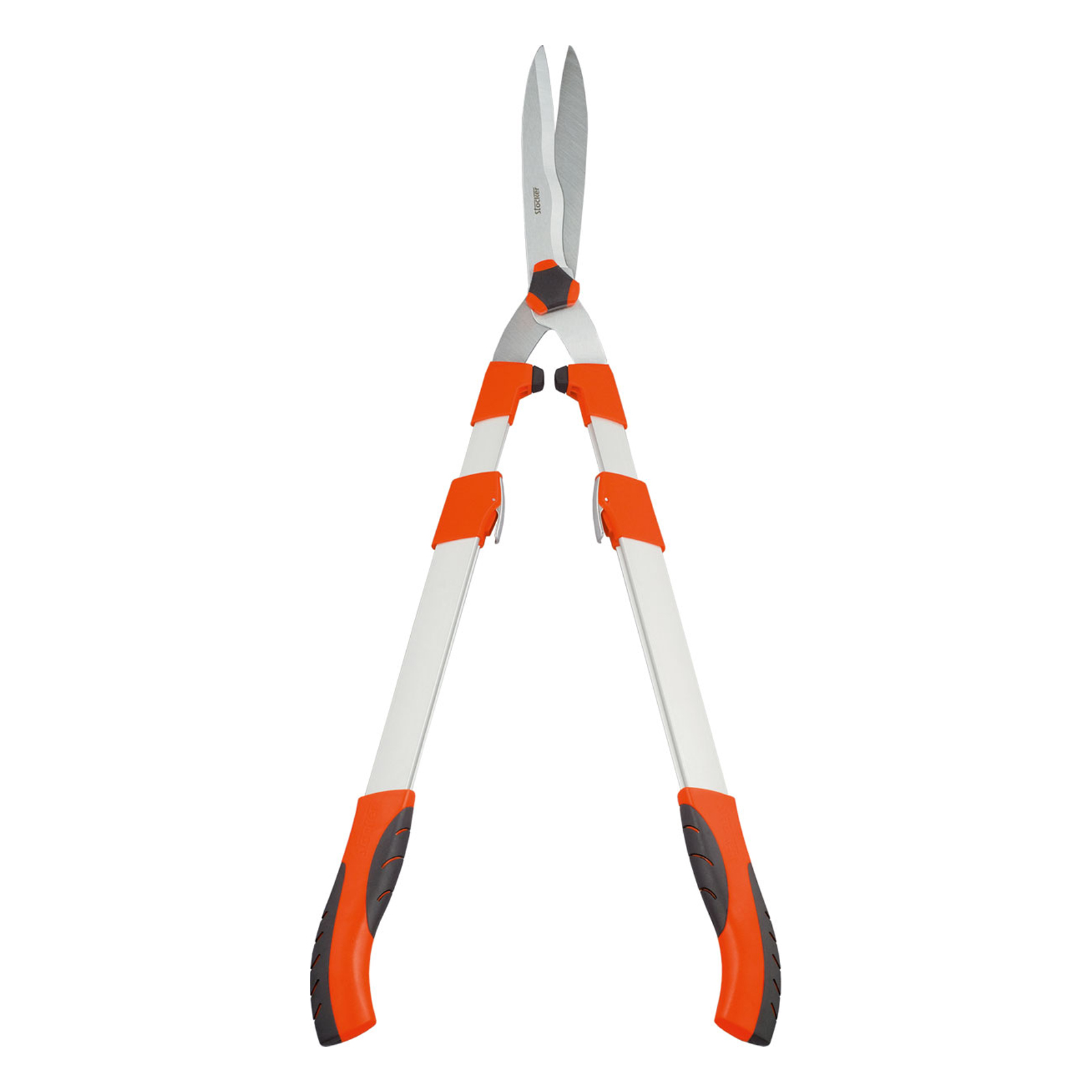 Tagliasiepi con manico telescopico in alluminio, impugnatura ergonomica, antiscivolo, lama ondulata.