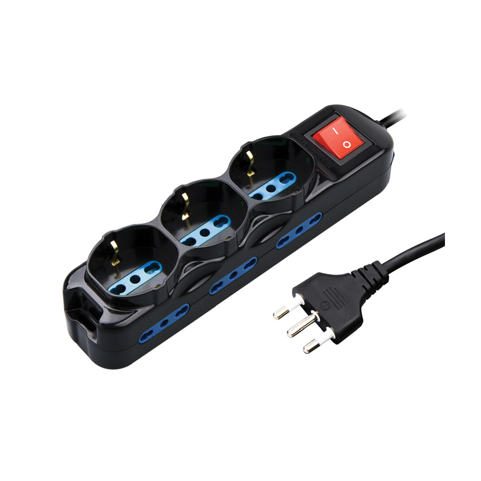 Multi presa con 3 uscite Schuko 2P+T 16A bipasso + 6 laterali bipasso 2P+T 16A – Spina 2P+T 16A – Lunghezza cavo 1,5 mt. – Sezione cavo 3×1 mm. – Interruttore