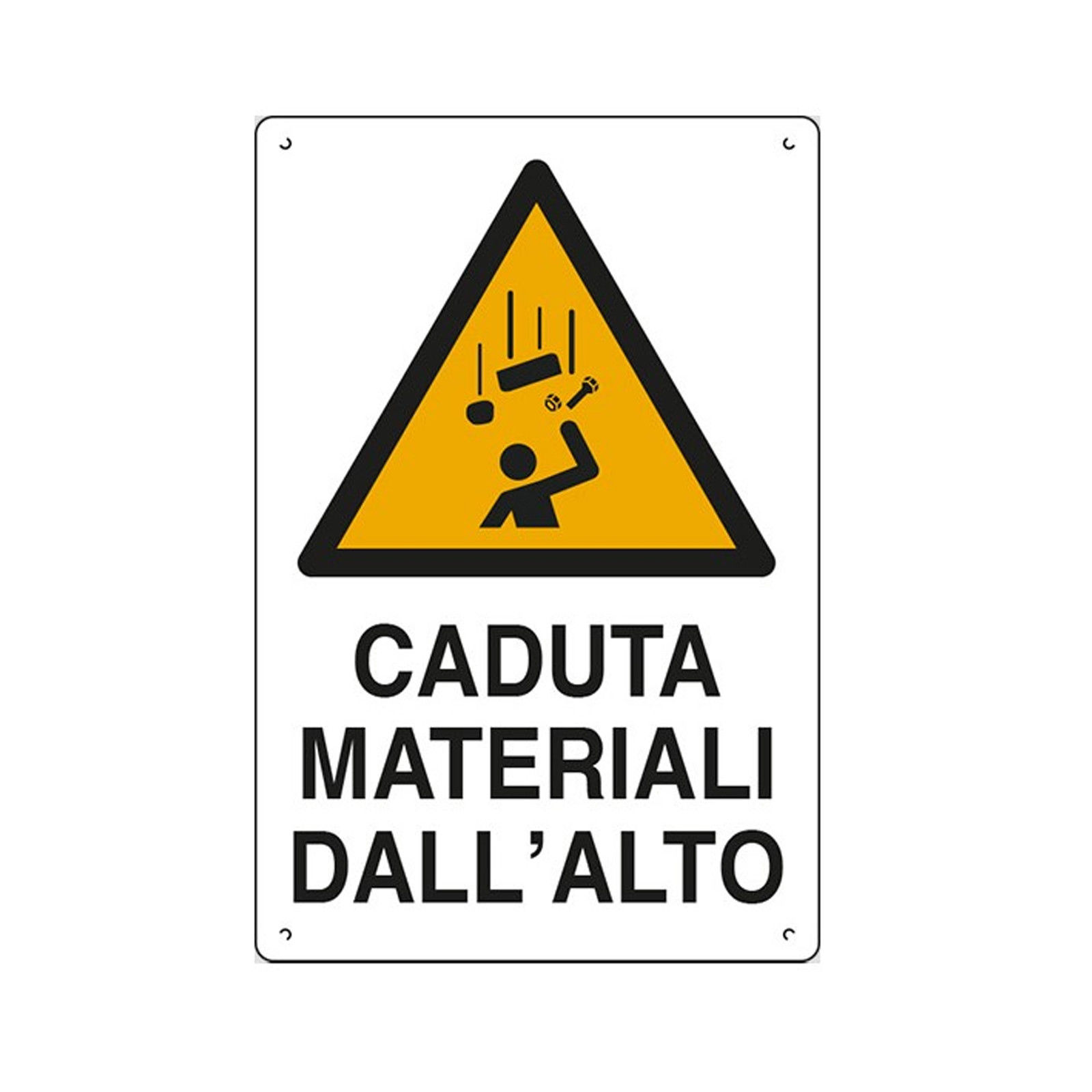Cartello formato 60x40cm in polionda utilizzabile in cantieri edili o stradali per avviso di caduta materiali dall’alto.