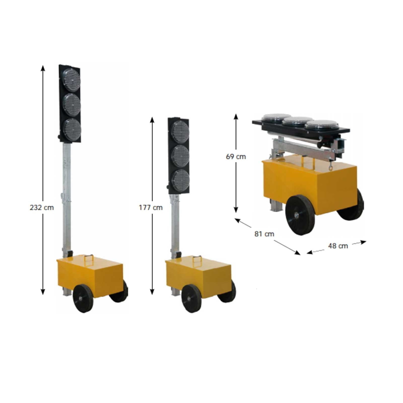 I semafori, grazie al modesto peso, al minimo ingombro ed al pratico carrello inferiore dotato di ruote maggiorate sono facilmente trasportabili.