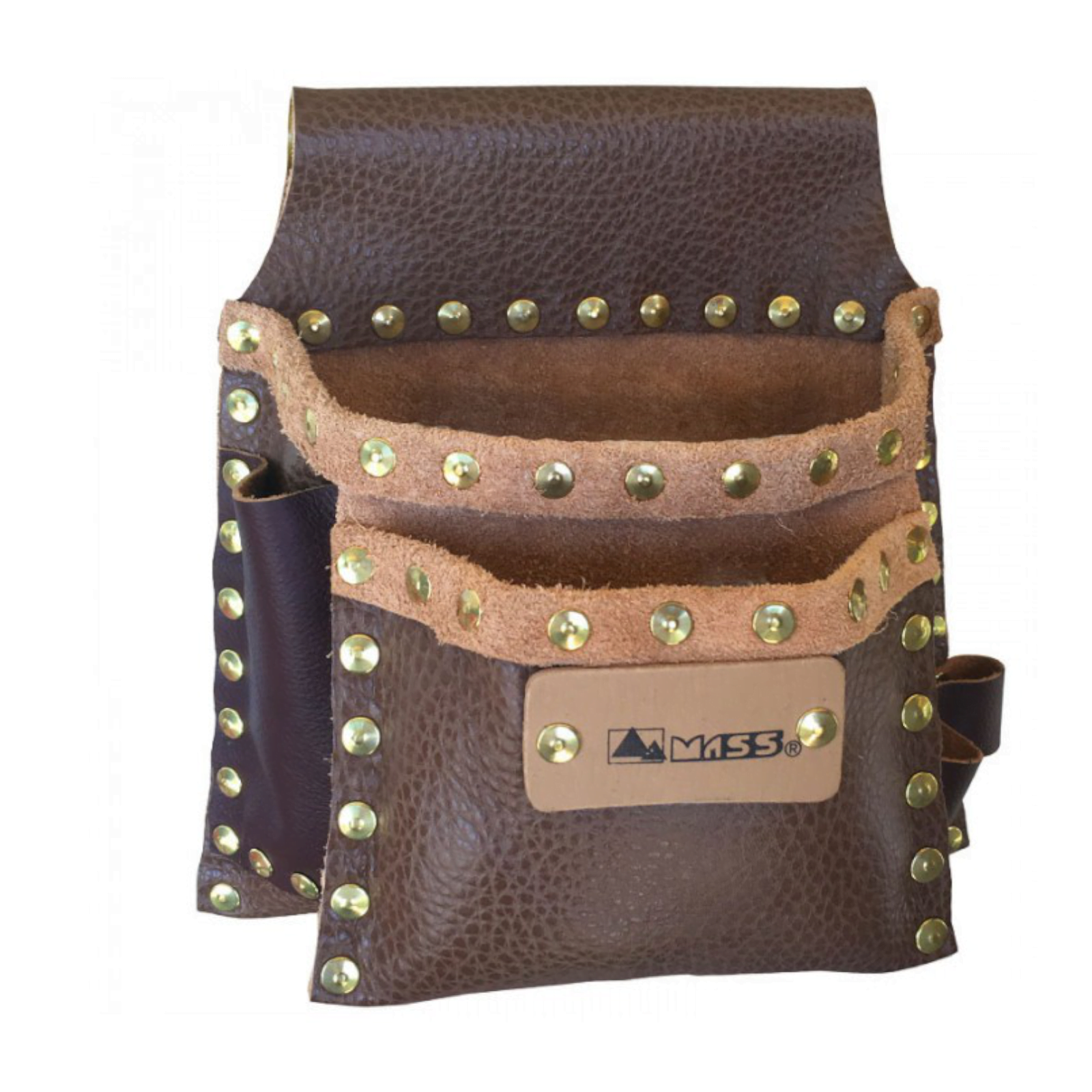 Borsa Carpentiere in pelle I° scelta Extra morbida, accuratamente rifinita a mano e compeltamente borchiata con rivetti dorati, tasca grande principale e tasca più piccola frontale, più tasche laterali per martello, tenaglia matite e doppiometro.