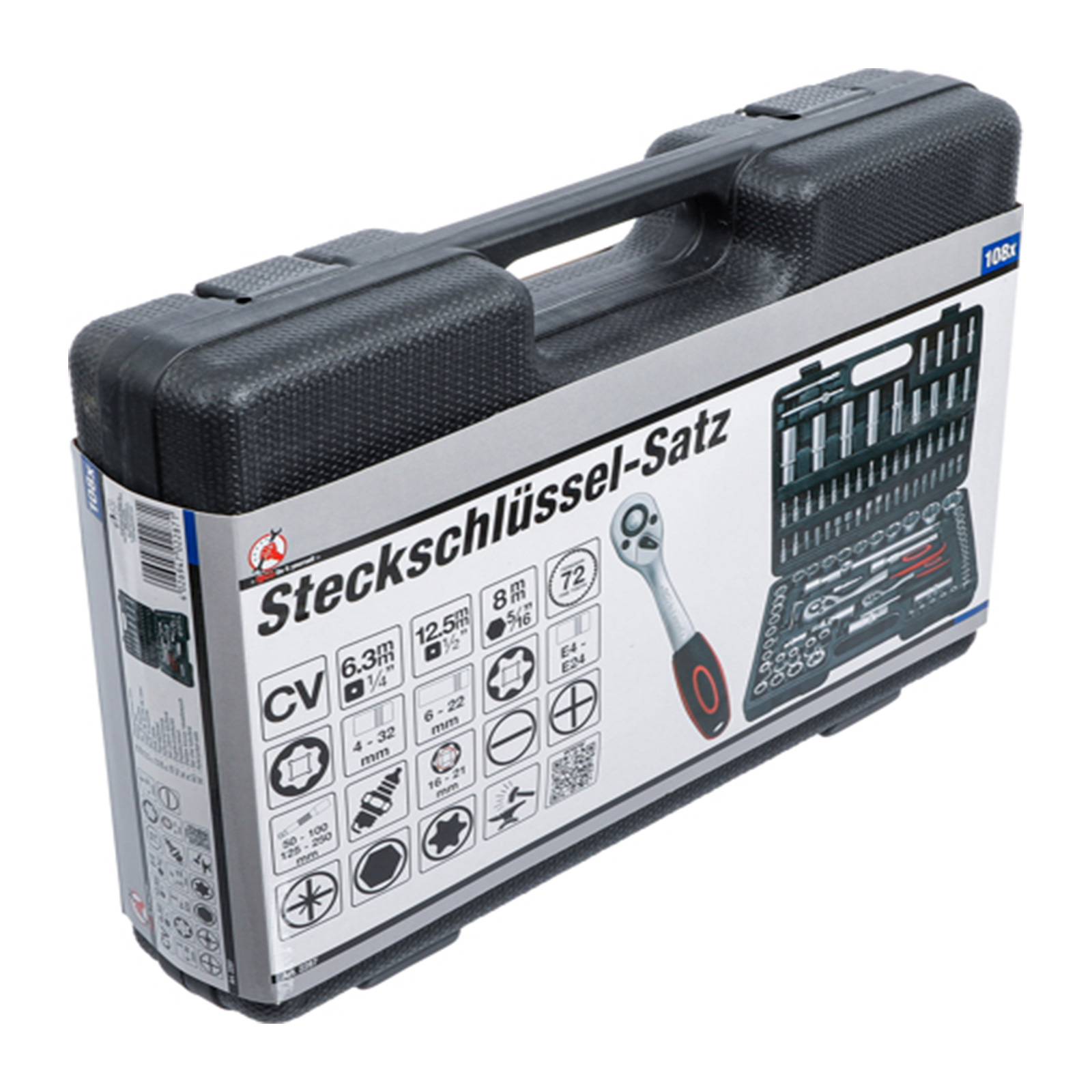 Cassetta di 108 pezzi con serie di chiavi a bussole di 6,3 mm (1/4″) e 12,5 mm (1/2″) BGS
