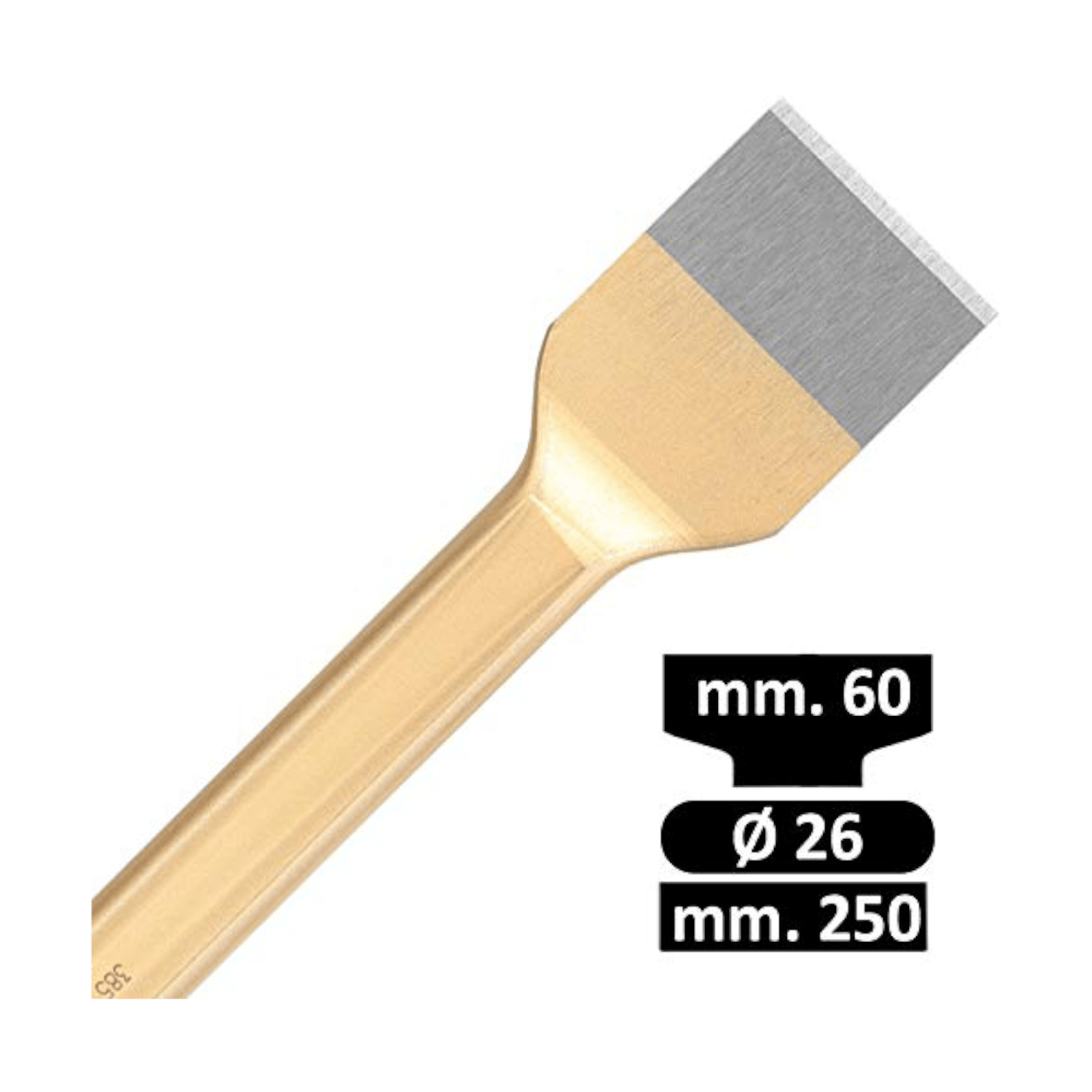 Scalpello piatto riaffilabile a taglio Excalibur Mass lunghezza 250 mm. Ø 26 mm. larghezza 60 mm. in acciaio legato ad altissima resistenza e speciale triplice trattamento termico.