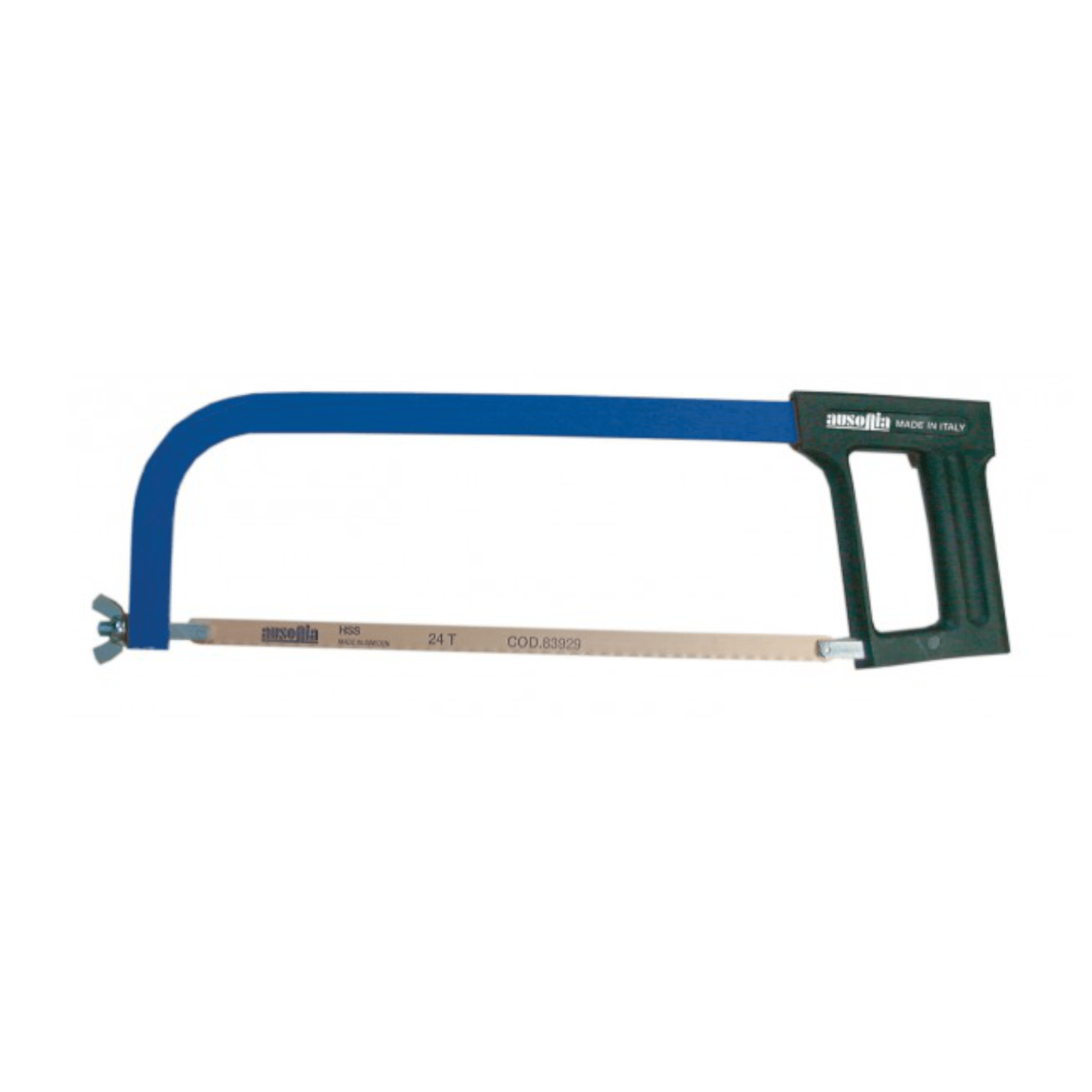 Fornito con lama professionale HSS Ausonia – telaio in tubolare mm 20×10, verniciato a polvere – tendilama con dado ad alette – comoda impugnatura in materiale plastico (moplen)